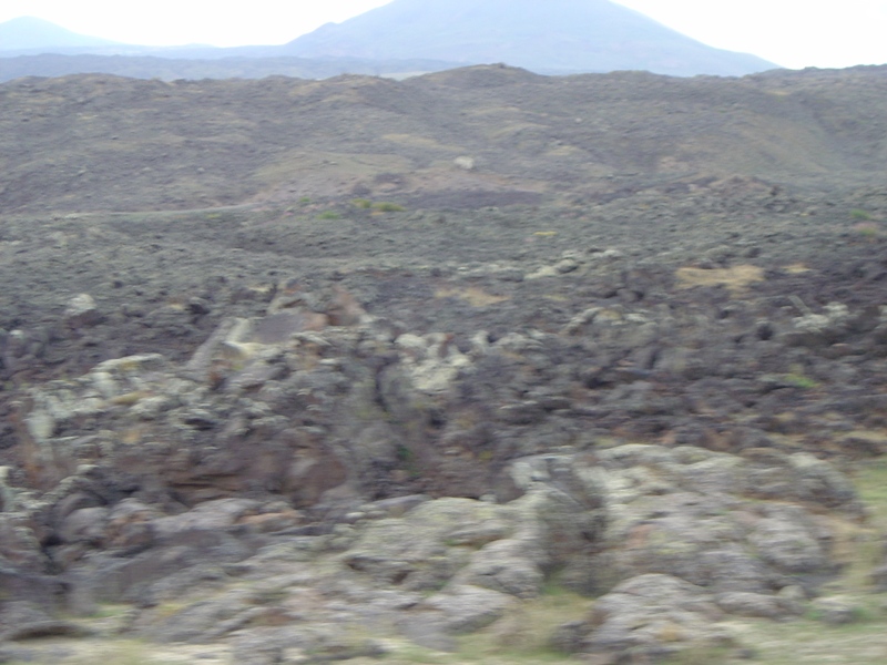 The road still seems endless. We are quite in the car. After the small oasis, the landscape changed. Petrified lava to our left, more lava to our right. The scene is dramatic. Thousands of years ago the earth got furious here, and volcanoes started erupting. The land was probably burning for months. We pass by a few settlements made up of mud houses and tents.